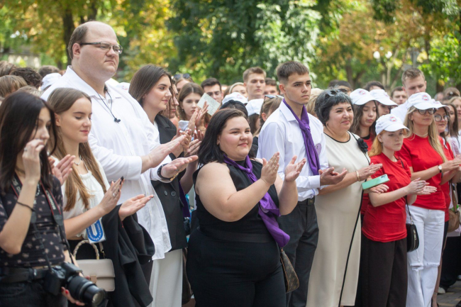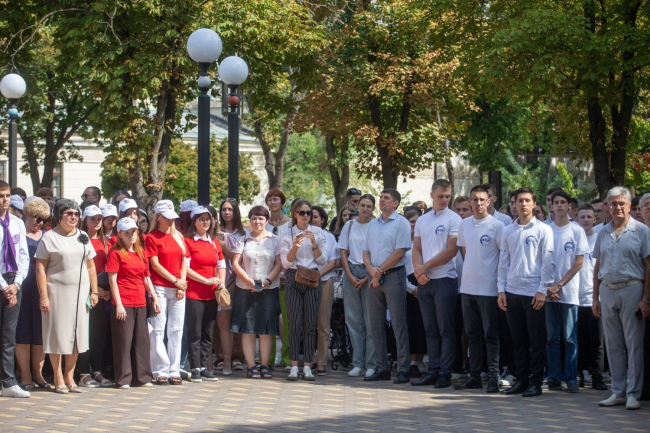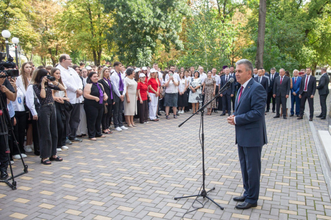 03 Sep, 2024, 15:18A festive event dedicated to the beginning of the new academic year was held at the university fountain site. The PMR President Vadim Krasnoselsky, the founder of the state university arrived to congratulate the university staff. The President said that a full-fledged comprehensive educational system has been created in Pridnestrovie, and the university, in addition to fulfilling the scientific and educational function, plays an important role in strengthening the Pridnestrovian statehood. Vadim Krasnoselsky focused on the high quality of education provided by the Pridnestrovian State University, and spoke about his student years within the walls of this university. The PMR President noted that in the past, the university infrastructure did not correspond to the level of the staff of the Pridnestrovian State University, which is represented by worthy teachers and talented students. The situation has changed dramatically at present. A global renovation of the university fund has been underway since 2020 at the initiative of Vadim Krasnoselsky. Individual infrastructure elements are included in the state capital investment program every year. Gagarin Boulevard adjacent to the university buildings was improved and the area now called the fountain area was put in order in 2021. The main building was renovated and re-equipped a year later, a classroom for the medical faculty equipped with an interactive complex was opened, and the student church of St. Tatiana was transformed beyond recognition. Located in the renovated and re-equipped "B" building "Quantum" multifunctional IT center was commissioned in 2023. The zoological and geological-mineralogical museums of Pridnestrovian State University are also located in this building, which opened their doors to visitors in April of this year. Today's opening of the large-scale reconstruction of building No. 3 ("B") of Pridnestrovian State University named after Shevchenko, built in the early 60s of the last century and which had not seen major repairs until now, was timed to coincide with the Day of Knowledge. Vadim Krasnoselsky emphasized the importance of the work being carried out and assured that it would be continued.