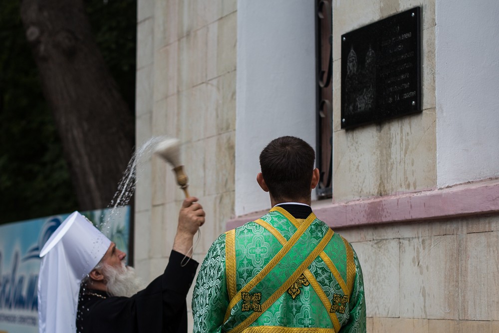 The pilgrims were joined by the Cossacks and OGRF military, who came to the place where the old cathedral had been with holy banners. Here, the bishops consecrated a memorial plaque to commemorate the Orthodox cathedral destroyed in the 1930th.