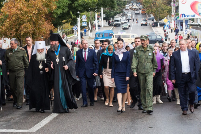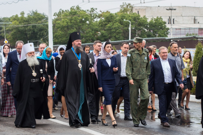 After the liturgy there was a cross procession from Nativity Cathedral to Tiraspol's Civil Registry Office, on which place there had been St Nicholas Cathedral. With Orthodox hymns, the procession, headed by Pridnestrovie's military, was moving along the central street. Together with parishioners and clergy, government members took part in the pilgrimage.