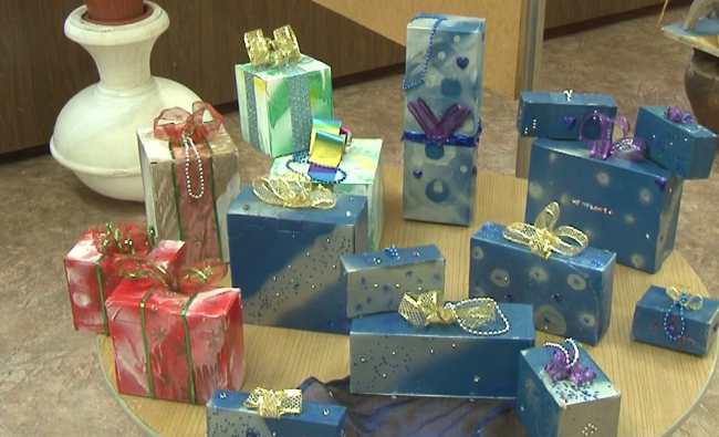 Подарки сделаны из разноцветных лент, обёрточной бумаги и пенопласта. Всего 50 коробочек и 50 конфет.