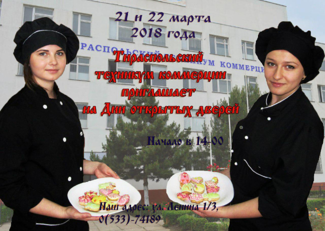 Тирасполь, 19 марта. /Новости Приднестровья/. 21 и 22 марта в Тираспольском техникуме коммерции пройдут дни открытых дверей, на которых учащимся расскажут о приемной кампании, преимуществах рабочих профессий, получаемых в учреждении, проведут экскурсию и покажут материальную базу.