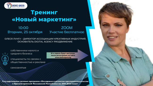 Тирасполь, 24 октября. /Новости Приднестровья/. 25 октября Торгово-промышленная палата ПМР организует тренинг «Новый маркетинг». Мероприятие будет проходить с 10:00 до 16:00 на платформе ZOOM.