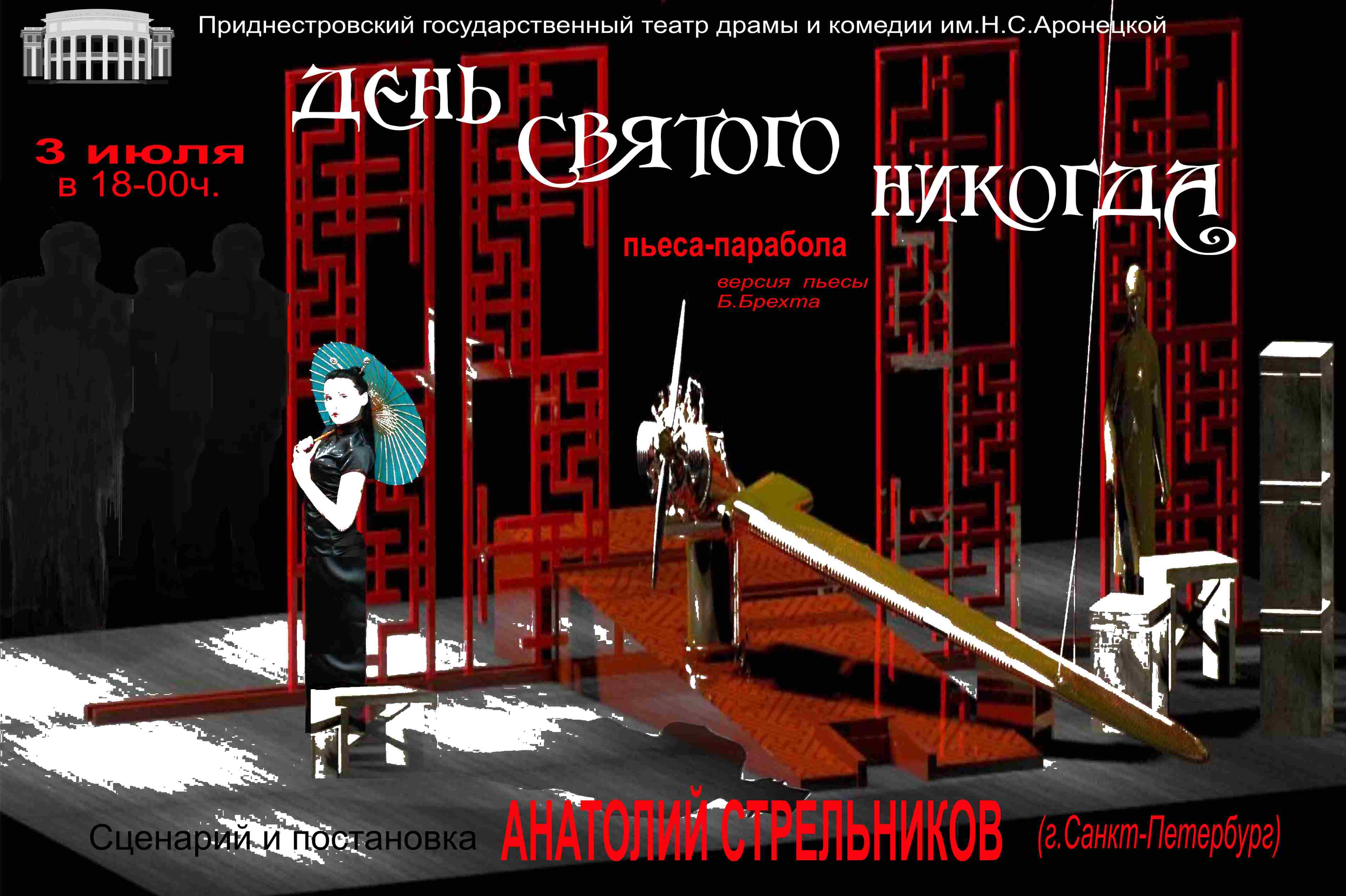 Тирасполь, 14 июня. /ИА «Новости Приднестровья»/. 3 июля в 18:00 Приднестровский государственный театр драмы и комедии им. Н.С. Аронецкой закрывает свой 46-й театральный сезон премьерой спектакля «ДЕНЬ СВЯТОГО НИКОГДА» по версии пьесы Бертольта Брехта «Добрый человек из Сычуани».