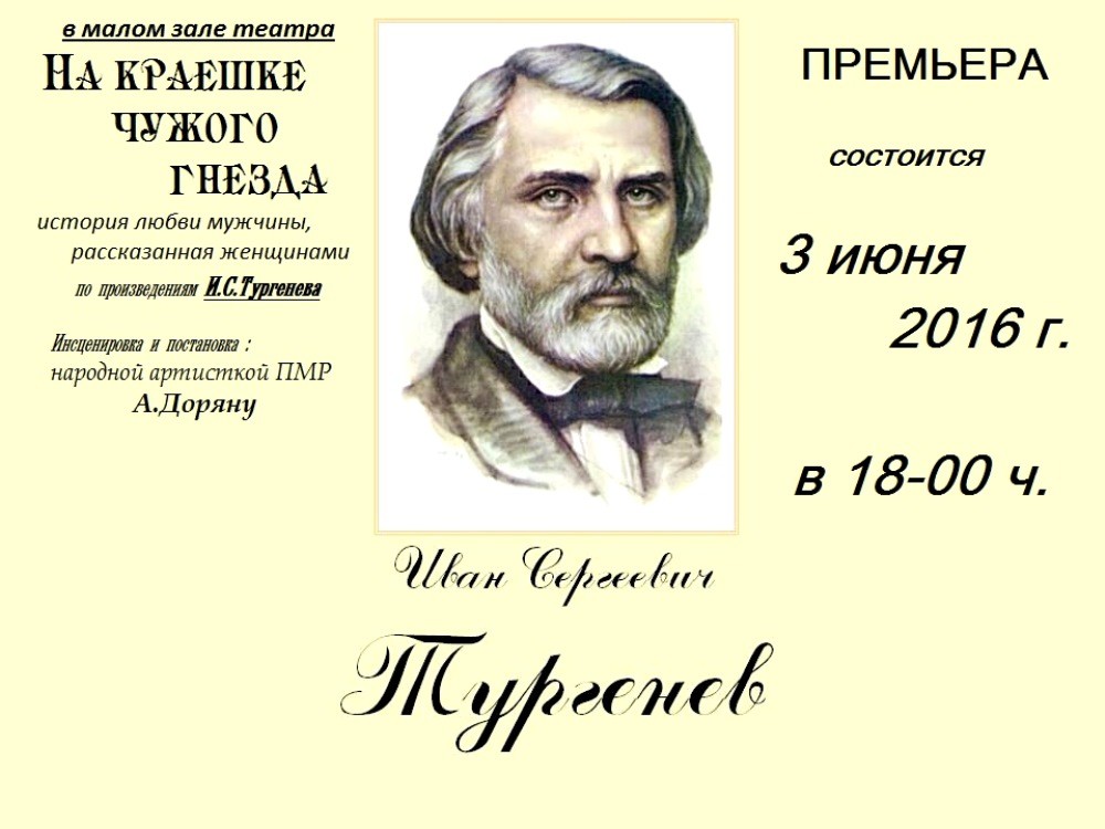 Спектакль «На краешке чужого гнезда» состоит из монографических отрывков биографии и писем великого русского писателя Ивана Тургенева, где чередуется проза с поэзией. Историю долгой любви к Полине Виардо в спектакле рассказывают актрисы театра. Режиссёр-постановщик спектакля малой формы – народная артистка ПМР Алла Доряну.