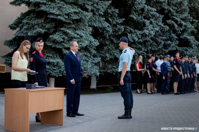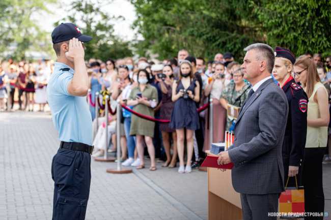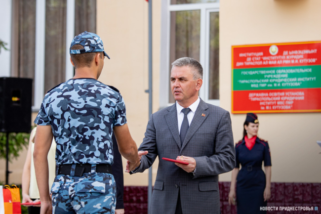 Тираспольский юридический институт в этом году окончили 62 курсанта, 7 из них получили красные дипломы. За активное участие в общественной жизни вуза лучшим курсантам Президент вручил ценные подарки.