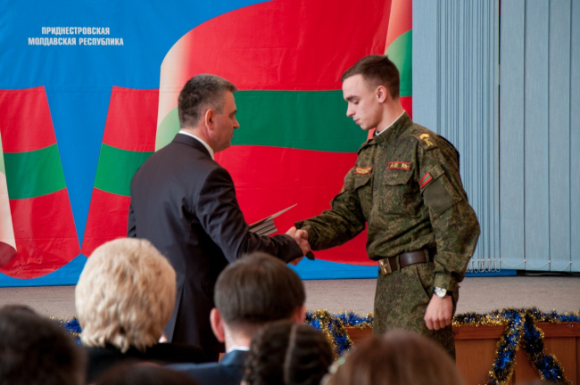 К собравшимся также обратился обладатель президентской стипендии курсант Тираспольского юридического института Андрей Думиника. Он поблагодарил руководство республики за то внимание, которое уделяется сейчас молодым людям.