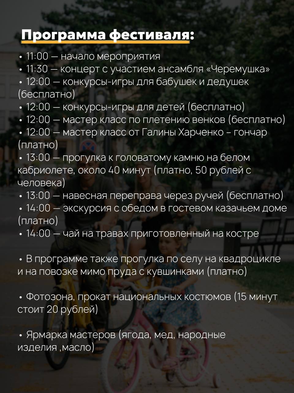 Фестиваль начнется в 11:00 возле сельского клуба и церкви на берегу речки Рашковка, которую гиды называю Золотой. Запланирована разнообразная культурная программа: концерт ансамбля «Черемушка», конкурсы для детей, мастер-классы по плетению венков и гончарному искусству. Будут также прогулки на кабриолете к Головатому камню – местной достопримечательности, экскурсии в казачьем доме, прогулка по селу на квадроцикле. На костре приготовят травяной чай, у фотозоны можно будет сфотографироваться в национальных костюмах, а на ярмарке мастеров можно будет полакомиться ягодами и медом.