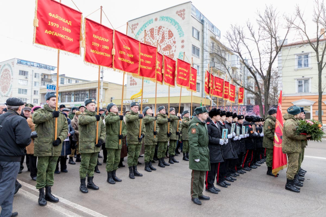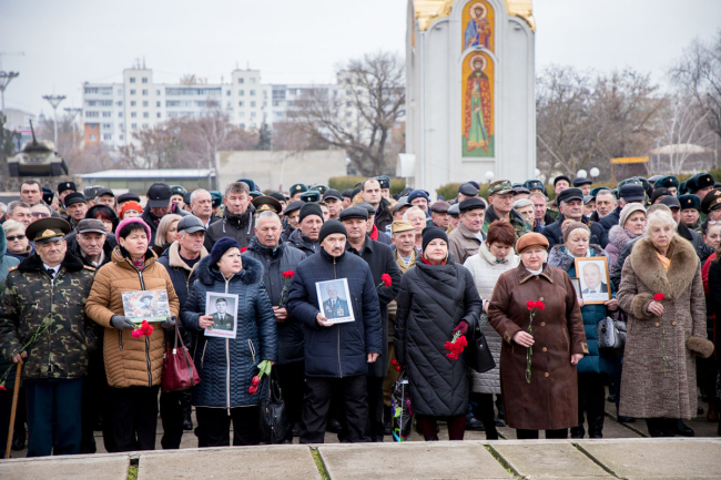 Тирасполь, 15 февраля. /Новости Приднестровья/. Сегодня на площади у кинотеатра «Тирасполь» было многолюдно как никогда. Мужчины в форме, женщины с цветами, дети, держащие в руках портреты погибших воинов, представители общественных организаций, трудовые коллективы, Президент ПМР и представители органов государственной власти. Всего порядка 300 человек.