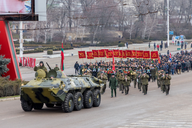 Спустя полчаса собравшиеся образовали колонны, в которые также вошли оркестр Главного штаба Вооруженных сил ПМР, юные суворовцы и курсанты военного института. Возглавил колонну бронетранспортёр.