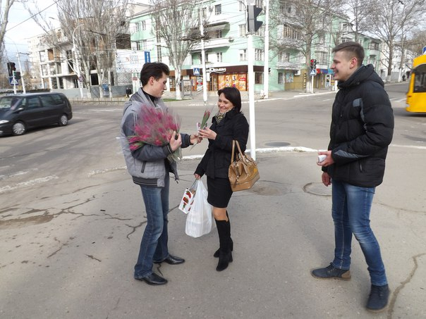 Молодые люди с самого утра раздавали на улицах столицы девушкам и женщинам подарки: тюльпаны и поздравительные открытки