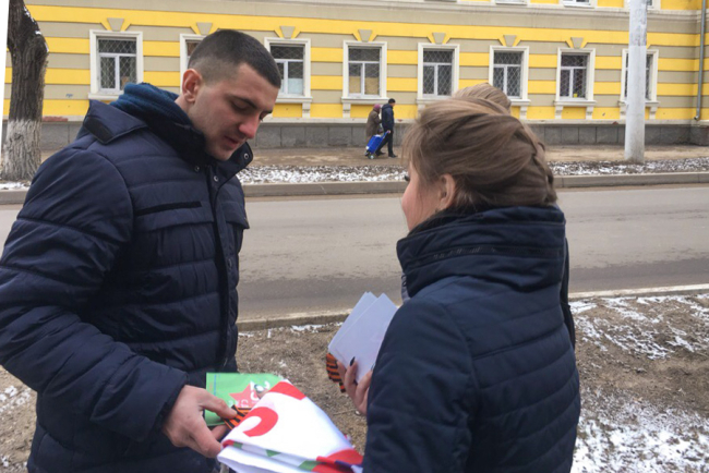 Тирасполь, 26 февраля. /Новости Приднестровья/. Активисты молодёжного движения «Звезда» устроили акцию ко Дню защитника Отечества в Тирасполе. Совместно со студентами ПГУ им. Т.Г. Шевченко ребята раздавали мужчинам поздравительные открытки и георгиевские ленты.