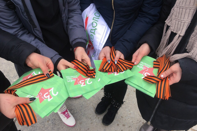В День защитника Отечества участники молодежного движения желали мужчинам счастья, благополучия и крепкого здоровья, а также любви и хорошего настроения. Всего активисты раздали более 300 поздравительных открыток и георгиевских лент.
