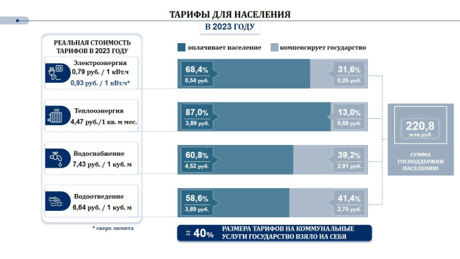 «Отпускные тарифы на коммунальные услуги для населения сохранены на прежнем уровне. В среднем около 40% размера тарифов на коммунальные услуги выражено в виде государственной поддержки, которая в 2023 году составила 220,8 млн рублей», - цитирует Александра Розенберга правительственная пресс-служба.
