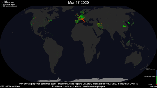 Студент из Калифорнии Эдвард Хаас на основе данных университета Джонса Хопкинса составил карту распространения коронавируса по разным странам мира. Как пишет Meduza, исходный код и готовую визуализацию он опубликовал на GitHub. На карте видно, как в течение длительного времени вирус не распространялся за пределы одного региона Китая, после чего перекинулся в Западную Европу и на Ближний Восток.