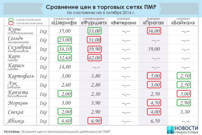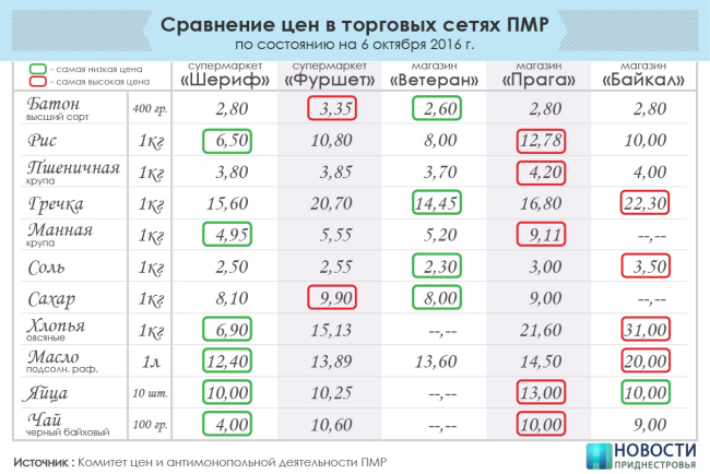 19 Окт., 2016, 11:33Тирасполь, 18 октября. /ИА «Новости Приднестровья"/. Комитет цен и антимонопольной деятельности опубликовал результаты мониторинга цен в крупнейших торговых сетях Приднестровья. ИА «Новости Приднестровья» проанализировало эти данные и подсчитало, где покупать дешевле те или иные продукты.