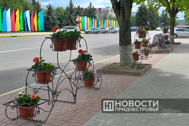 Дубоссары, 23 апреля. /Новости Приднестровья/. Дубоссары готовятся к майским праздникам. На площади Победы обновили цветы на металлических арках, теперь конструкции украшают разноцветные герани. Также представители местного ПУЖКХ установили новые флаги в центре города.