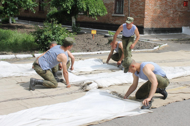 На специально оборудованных учебных местах военнослужащие учились правильно укладывать парашют, отрабатывали посадку в самолёт и размещение в нём, а также действия во время полёта и после приземления.