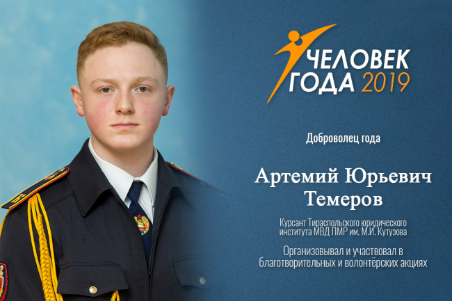 Тирасполь, 19 февраля. /Новости Приднестровья/. Победную статуэтку, медаль и диплом конкурса «Человек года» в номинации «Доброволец года» вручили курсанту 1 учебного взвода 4 курса ГОУ «Тираспольский юридический институт МВД ПМР им. М. И. Кутузова» Артемию Темерову.