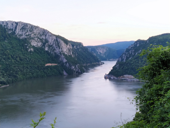 Границу с Сербией мы пересекали в районе Джердапа, гидроэлектростанции на Дунае. Это безумно красивые места: дорога тянется вдоль одноименного национального парка с одной стороны и могучей реки – с другой. Трасса достаточно узкая, так что иногда возникает впечатление, что ваш автобус плывет по Дунаю. Нам удалось остановиться у Джердапского ущелья, которое также называют Железными Воротами: скалы Большой и Малый Казан «обнимают» Дунай с двух сторон, и он, кажется, не без труда протискивается между ними – здесь ширина могучей реки всего 150 метров. Удивительное место, где природа будто сыграла с ландшафтом в догонялки. Сам изгиб Дуная здесь чем-то напомнил мне Днестр в районе не менее живописной Красногорки.