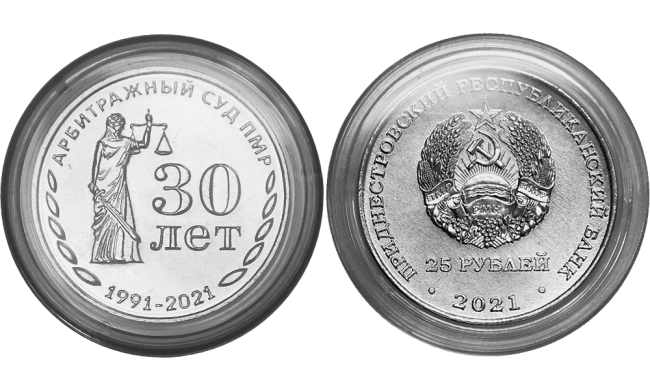 Тирасполь, 21 сентября. /Новости Приднестровья/. Приднестровский республиканский банк ввёл в обращение памятные монеты из недрагоценных металлов «30 лет со дня образования Арбитражного суда ПМР» серии «Государственность Приднестровья». Их номинал – 25 рублей, тираж – 2,5 тысячи штук, говорится в пресс-релизе Центробанка.
