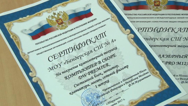 Руководитель русской общины «Добрыня», депутаты и представители учебных заведений поблагодарили РФ за помощь. В рамках Программы поддержки соотечественников вот уже четвертый год школы и детские сады Бендер получают компьютерную технику. В начале 2017 года сертификаты вручили 4 школам и двум детских садам, теперь — новое поступление такой необходимой для учителей и учеников техники.