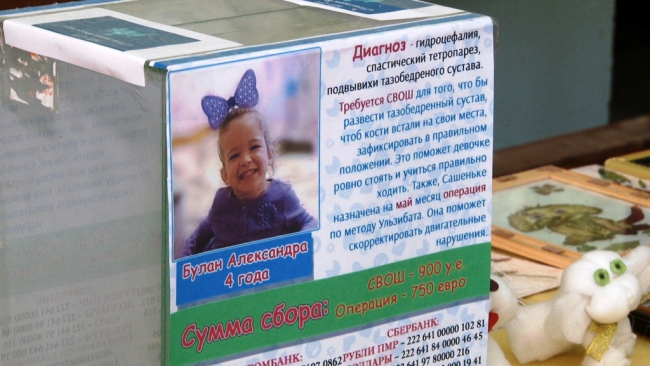 Александре Булан 4 года и три месяца, девочка – инвалид детства: после полученной родовой травмы ей поставили диагноз гидроцефалия, спастический тетрапарез, подвывихи тазобедренного сустава. Для того чтобы Сашенька могла ходить, необходима операция, которую будут проводить специалисты из России. Мама девочки – Екатерина Булан - воспитывает дочь сама, из-за болезни ребенка не работает, собрать средства для лечения ребенка своими силами не получалось. Помощь дубоссарской семье оказали неравнодушные люди – друзья и волонтерская организация «Поможем вместе».