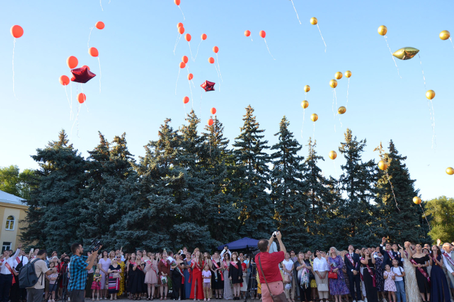 Поздравили выпускников с важным событием в их жизни своими выступлениями и образцовые коллективы Дворца детско-юношеского творчества – Театр песни «Овация» и ансамбль эстрадного танца «Серпантин». Герои торжества выпустили в небо воздушные шары — как символ уходящего детства.
