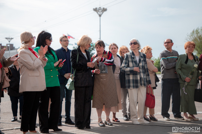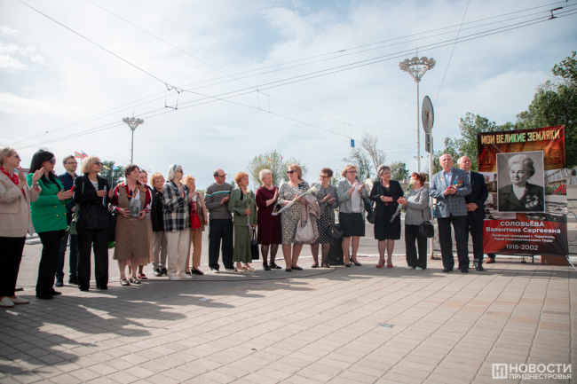 Небольшой митинг провели прямо у дома, где теперь висит баннер. Ветераны швейной фабрики вспоминали заслуги своего руководителя и её участие в жизни Тирасполя.