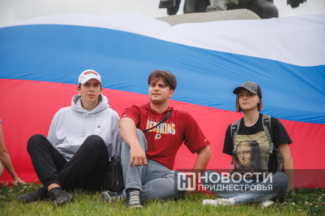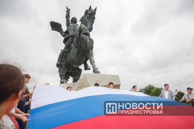 Тирасполь, 12 июня. /Новости Приднестровья/. В День России в Тирасполе провели акцию. Прямо в центре города развернули большой флаг. Такие акции Союз русских общин при поддержке молодёжных и волонтёрских организаций проводит каждый год. Большой российский триколор растягивали возле театра, в парке «Победа» и, конечно же, у памятника Суворову.