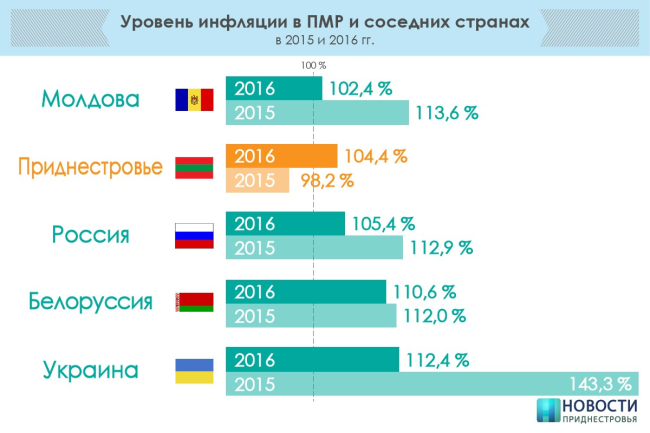 Сравним инфляционные процессы в странах региона с ситуацией в Приднестровье. У нас, как утверждает финансовая статистика, общий рост цен в 2016 году составил 4,4%, то есть инфляция была несколько больше, чем в Молдове, но ниже по сравнению с Россией и Украиной. Свое влияние оказали девальвационные ожидания, связанные с курсом приднестровского рубля. Девальвация в итоге стала реальностью. Но были и сдерживающие факторы — государственное регулирование тарифов на жилищно-коммунальные услуги, а также высокий урожай овощей и фруктов, приведший к тому, что цены на них, как и в других странах региона, снижались. Все это инфляцию умерило.