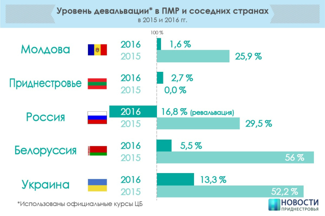 Как отмечает в своем обзоре Приднестровский республиканский банк, гривна в 2016 году потеряла только 13,3% своей стоимости против 52,2% годом ранее. Белорусский рубль обесценился на 5,5%, тогда как в 2015 году его девальвация составила 56%.