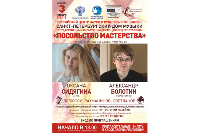 Тирасполь, 29 октября. /Новости Приднестровья/. Международный музыкальный проект «Посольство мастерства» снова посетит Тирасполь. На этот раз его участниками станут Оксана Сидягина (арфа) и Александр Болотин (фортепиано).