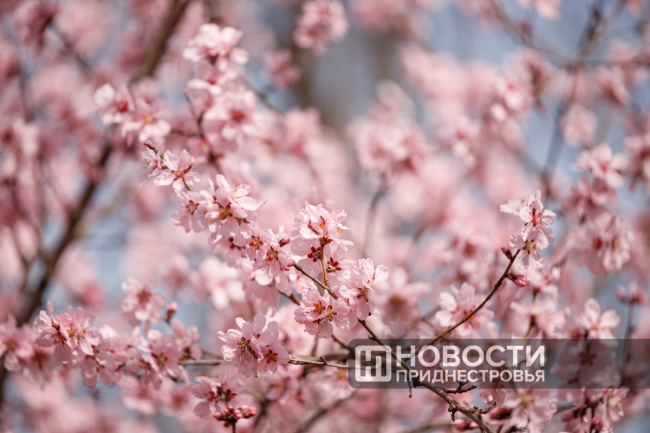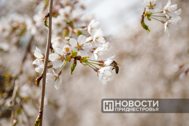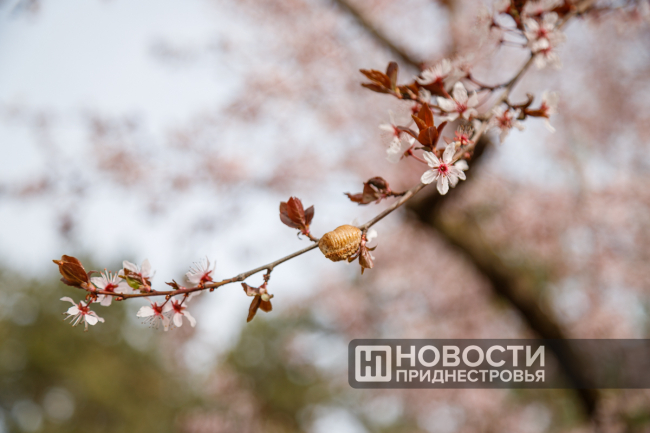 Ну а пока посетители могут насладиться видами плодовых деревьев: плакучей черешни, персика и вишни. Это всё ранние сорта косточковых пород. Ещё в пятницу были только бутоны, а уже в понедельник все деревья оказались в цвету.