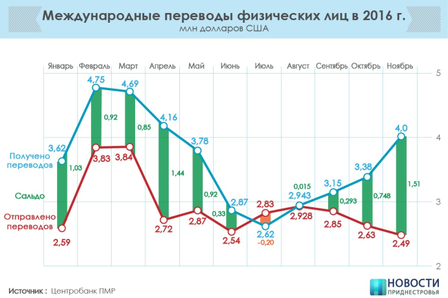 Всего за 11 месяцев 2016 года сумма денежных переводов из-за рубежа составила порядка 40 млн долларов, в то же время граждане в другие страны отправили немногим более 32 млн. Сальдо за январь-ноябрь сложилось в сумме 7,8 млн долларов.