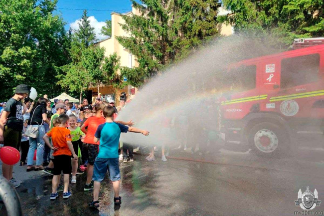Кульминацией праздника стало показательное выступление пожарных. На несколько минут они превратились в настоящих волшебников и помогли детям дотянуться до радуги в буквальном смысле. Для этого вместо волшебной палочки использовали брандспойт.