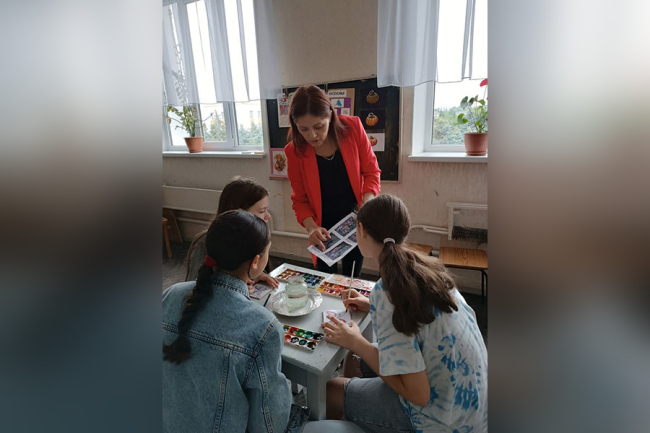 Преподаватели высшей квалификационной категории Оксана Пономаренко и Дильнара Турсунова, набирающие учащихся в 1-й класс, провели для ребят мастер-классы. Дильнара Асымжановна познакомила гостей с техникой монотипии и предложила желающим нарисовать бабочку. Оксана Владимировна знакомила ребят с техникой создания гобелена.