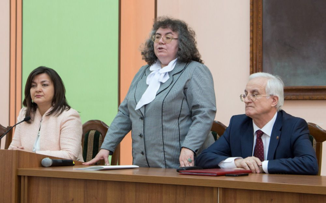 Советник президента зачитала указ президента от 16 января, согласно которому Галина Сандуца освобождена от должности ректора вуза. Этим же указом исполнение обязанностей ректора Приднестровского госуниверситета возложено на почетного президента вуза Степана Берила.