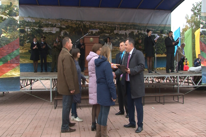 На главной площади Руслан Чабан вручил почётным дубоссарцам государственные награды, трудовым династиям – подарки, а самым юным жителям Дубоссар – паспорта ПМР.