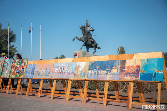 Рядом с шарманщиком расположились преподаватели и ученики городской художественной школы имени А.Ф. Фойницкого. Художники подготовили выставку картин, посвящённых Тирасполю, и прямо на площади рисовали этюды.