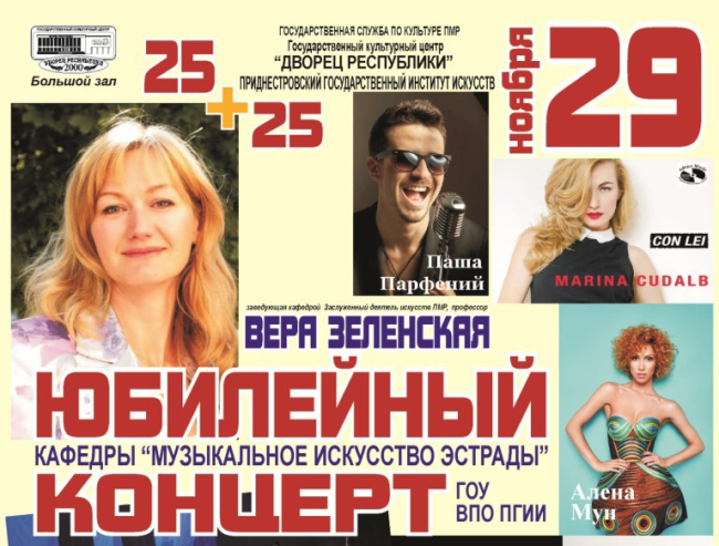 Концерт эстрадной и джазовой музыки «25+25» посвящён юбилеям кафедры «Музыкальное искусство эстрады» Приднестровского государственного института искусств и её заведующей — заслуженному деятелю искусств ПМР Вере Зеленской.