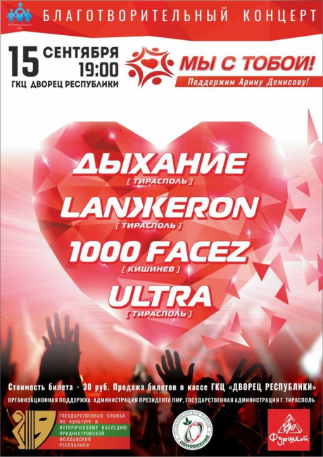 15 сентября во Дворце Республики своим творчеством порадуют зрителей приднестровские музыкальные группы «Дыхание», «LanЖeron», «Ultra» и гости из Кишинева — «1000 FACES».