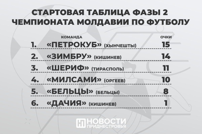 Выше в таблице высшей лиги расположились «Петрокуб» (15 пунктов) и «Зимбру» (14 баллов). В топ-6 команд высшего эшелона молдавского футбола вошли также «Милсами», «Бельцы» и «Дачия-Буюканы».