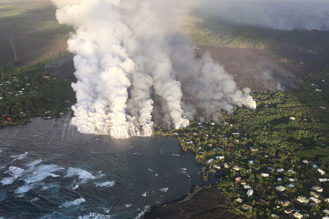 Лава извергающегося вулкана Килауэа на Гавайских островах продолжает заполнять залив Капохо, сообщает Associated Press. В результате образовалась еще почти миля суши (1,6 км).