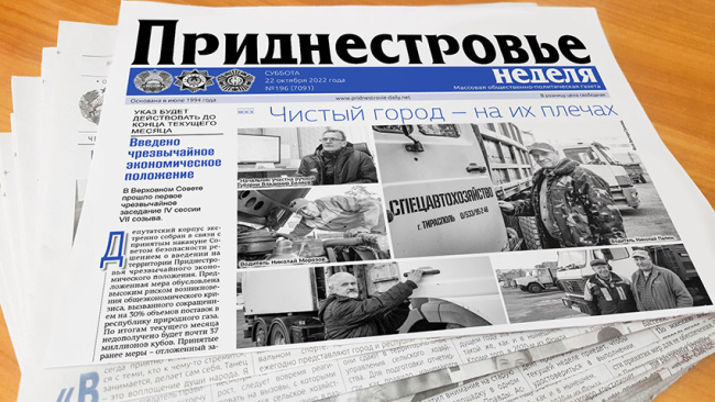 Тирасполь, 21 октября. /Новости Приднестровья/. Субботний номер главной газеты республики расскажет о решениях Верховного Совета в связи с введением чрезвычайного экономического положения на территории ПМР, а также о тех, кто делает Тирасполь чище, познакомит с работой культурно-просветительского центра при Покровской православной старообрядческой общине и не только.