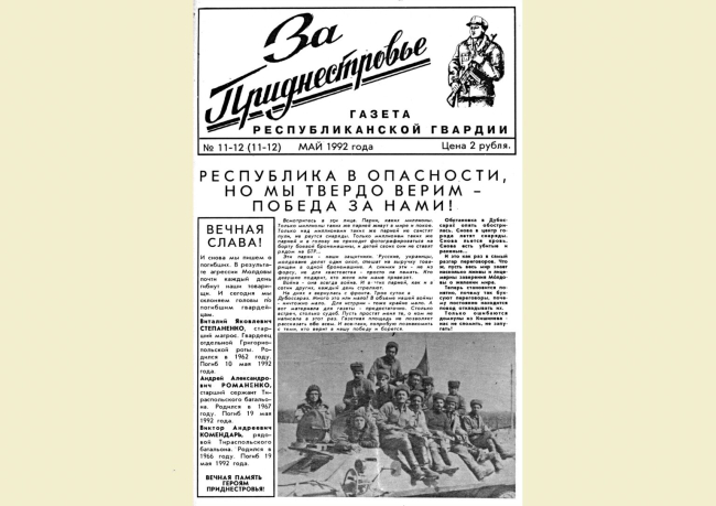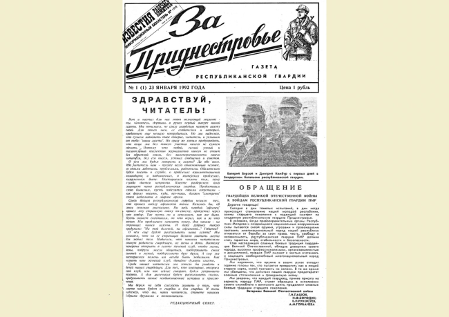 «В первом выпуске газеты было письмо родителей гвардейцев, которые благословляли своих сыновей, был рассказ о гвардейце, который воевал в Афганистане, и другие материалы. Трудностей в сборе материалов в тот период не было. Рабочий комитет взял на себя расходы по выпуску газеты, по предоставлению бумаги. Первые выпуски газеты были с плашечкой "Известия Рабочего комитета". Над названием газеты долго не думали, решили назвать по образцу газет времен Великой Отечественной войны – "За Приднестровье". Наш художник, который рисовал первый заголовок названия, забыл поставить восклицательный знак, так название и осталось. Специально выбрали альбомный формат газеты, чтобы ее было удобно читать», – вспоминает первый редактор газеты "За Приднестровье" Наталья Воробьева.