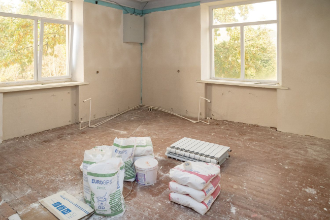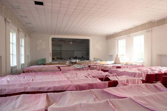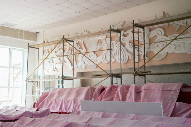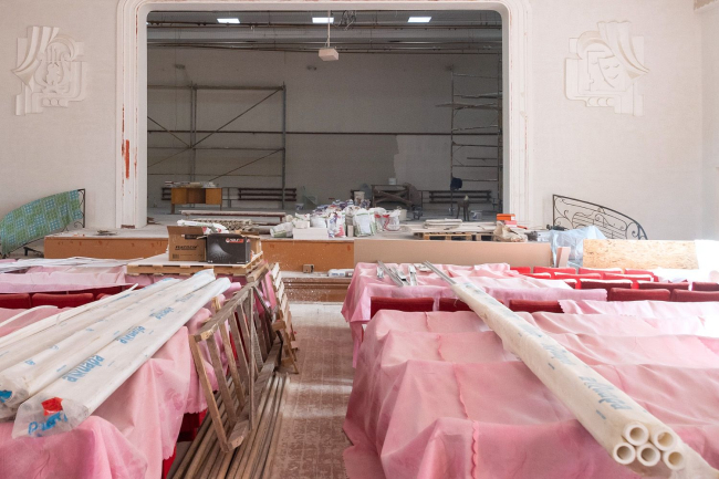 До конца текущей недели должны закончить замену систем водоснабжения и отопления. В актовом зале приводят в порядок пол, реставрируют сцену.