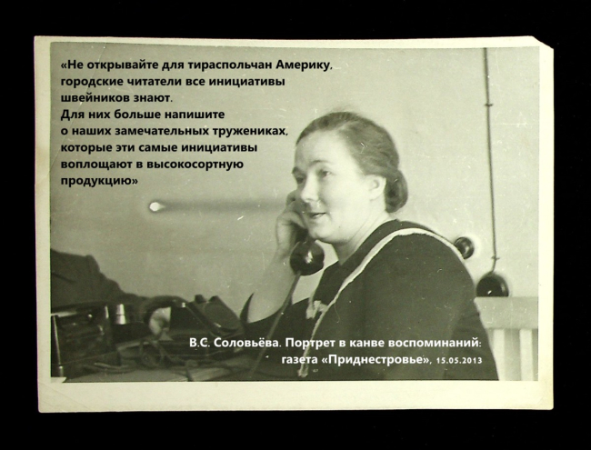Так, в частности, на выставке представлен документальный фильм «Тираспольская марка» (1975), а также фотодокументы из фондов ЗАО «Одема» и личного фонда Валентины Соловьёвой – Героя Социалистического труда, генерального директора предприятия и почётного гражданина Тирасполя.