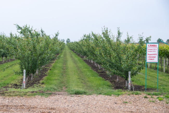 Побывали участники выездной встречи в садах и виноградниках «АгроКомпакта». Четыре года назад здесь были ячменные поля. Начинали садоводство с 20 гектаров, сейчас – уже около 170 га (62 га яблоневых садов, 50 га занимает сливовый сад, 16 га засажено абрикосовыми деревьями, 7 га черешней, 8 га – виноградник). В планах – дальнейшее увеличение садовых площадей и, соответственно, наращивание объемов производства фруктов.