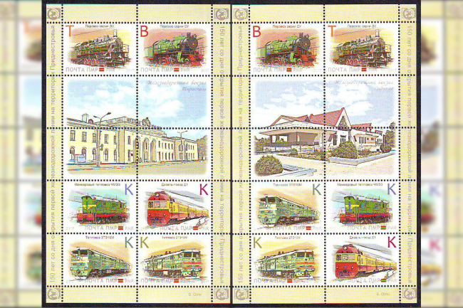 На марках изображены старые и современные локомотивы. На купонах малых листов представлены железнодорожные станции: «Тирасполь», «Бендеры-1», «Бендеры-2», «Рыбница». Тираж марок составил по 2 800 экземпляров каждой (по 700 малых листов).