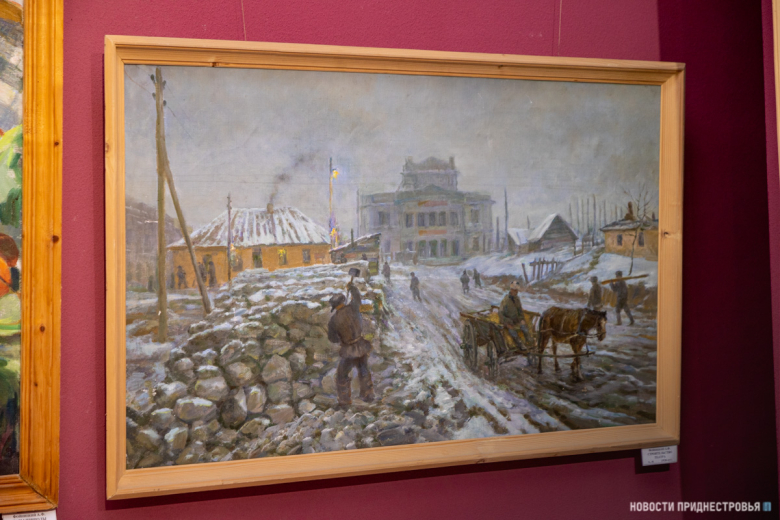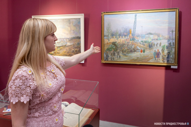 Старший научный сотрудник столичной картинной галереи Людмила Мирончук рассказала, что большая часть картин посвящена восстановлению и строительству города после немецкой оккупации. Есть и городские пейзажи, выполненные в 40-60-е годы ХХ века.